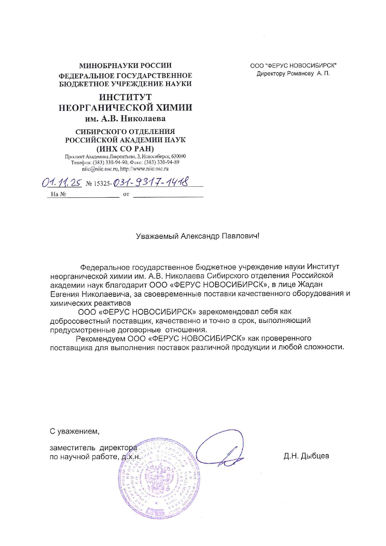 Федеральное государственное бюджетное учреждение науки Институт неорганической химии им. А.В. Николаева Сибирского отделения Российской академии наук благодарит ООО "ФЕРУС НОВОСИБИРСК", в лице Жадан Евгения Николаевича, за своевременные поставки качественного оборудования и химических реактивов.